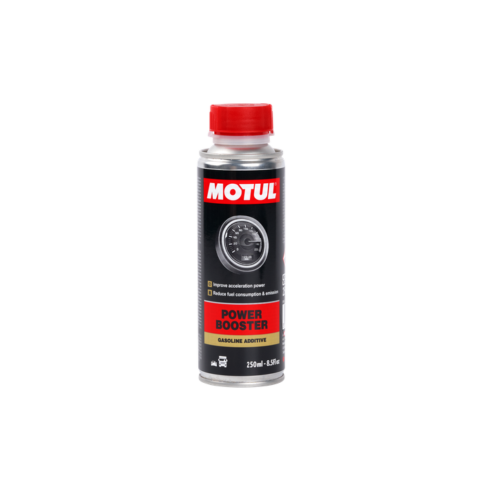 Motul Power Booster is an additive to add to gasoline. TYPE OF USE MOTUL POWER BOOSTER is suitable for all kinds of gasoline engines. PERFORMANCE Improve the atomization effect of the injector and save fuel. Reduce the friction between the cylinder and the piston, and boost power. Improve cold starting performance. Effectively remove deposits and vanishes etc. from combustion chambers, injectors, intake valves, and clean the fuel system. Remove the condensed water from the bottom of the gasoline tank and prevent rust and corrosion. RECOMMENDATIONS Directly pour one can of POWER BOOSTER into the fuel tank before refuelling. If the engine has not been cleaned for over a long period of time, black smoke might be observed from the exhaust gas after using the product as it works to remove the deposits. Black smoke will be reduced or eliminated after repetitive use of the product. A can of POWER BOOSTER is sufficient for tank capacity 60 litres. SECURITY Refer to the MSDS and the information mentioned on the product label bottle for further details