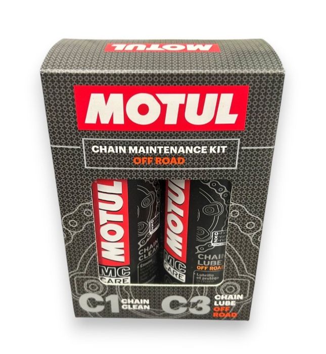 Chain Maintenance kit including C1 Chain Clean, C3 Chain Lube Road 150ml, packaged in a specific MC Care kit box