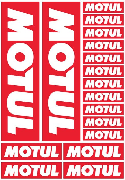 A4 sheet with a selection of Motul stickers, 2x 22.5cm x 6cm, 11x 6.5cm x 1.7cm, 4x 9.5cm x 2.5cm. Laminated