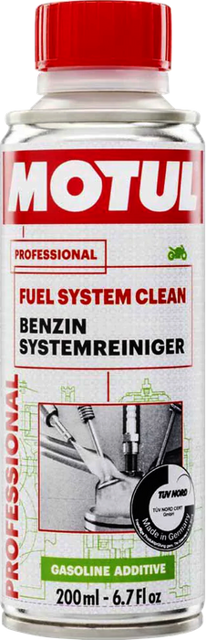 Motul Fuel System Clean Moto is designed to be used in all types of engines with injection or carburettors, with or without catalytic converter, using all kinds of gasoline. It effectively cleans dirtying and clogging which appears in the whole fuel system. It provides a perfect lubricantion during cleaning process and prevent removed micro-particles from depositing.