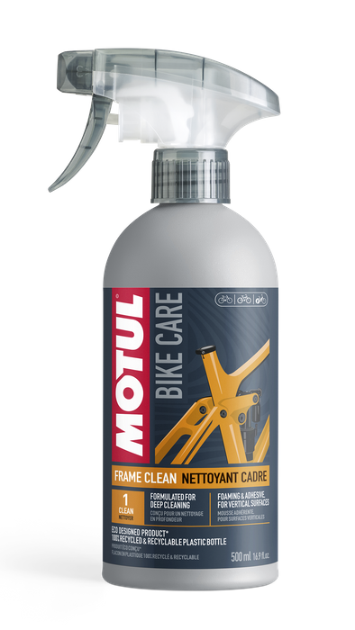 Strong cleaner for bike frames - Adhesive formula, doesn’t drip off redu¬cing product waste - Safe for powder-coated surfaces and sensitive materials such as carbon fiber, lacquer, chrome and plastics