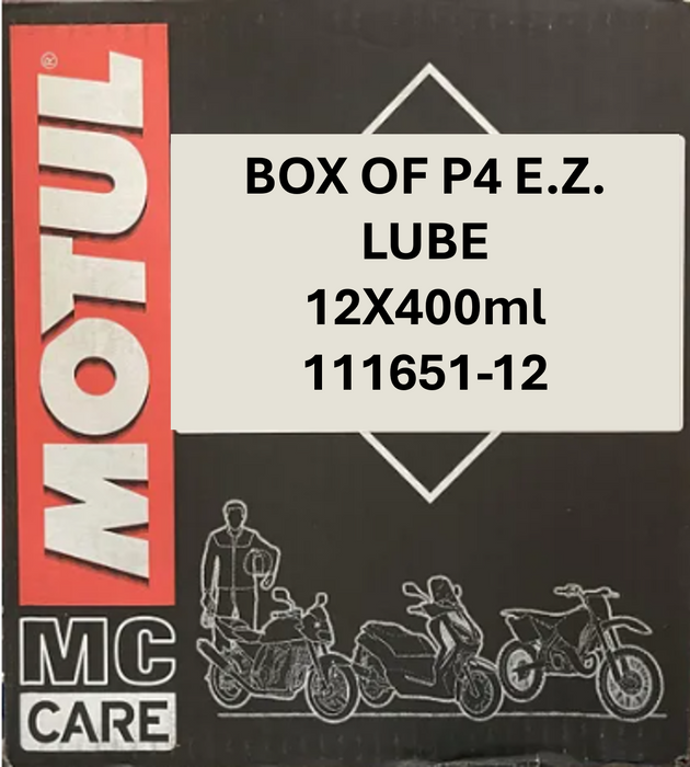 BOX OF 12 P4 E.Z. LUBE 400ml Motul® MC CARE ™ P4 E.Z. Lube is a multi-purpose fluid lubricant that unblocks, lubricates and protects from corrosion all metal parts by depositing a protective film.