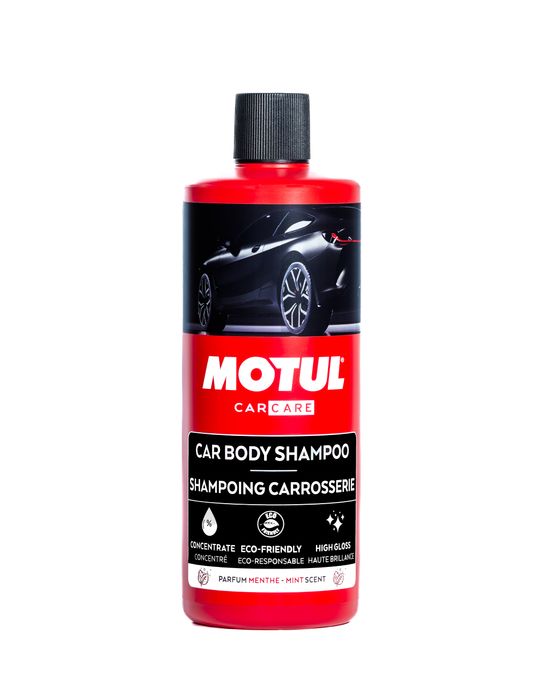 MOTULĀ® Car Body Shampoo safely cleans painted or non-painted car surfaces allowing the water to bead off, accelerating the drying process. Leaves a bright and durable finish, the gentle formula will not strip wax or sealed paint surfaces. Car Body Shampoo heals damaged varnishes and leaves a bright, deep, and durable shine thanks to the wax in the formula. Leaves a dry protective film drying without leaving traces. Protects paints and varnishes. Pre-rinse the vehicle Mix to a ratio of +/- 25ml / 3L of clean water in a bucket or apply direct to surface using a foam gun, then use a Motul Microfiber Noodle Mitt to fully agitate deposits and grim on the surface, rinse with water then dry the surface with a microfiber towel. DO NOT use under direct sunlight or on hot surfaces. 50% recycled plastic bottle.